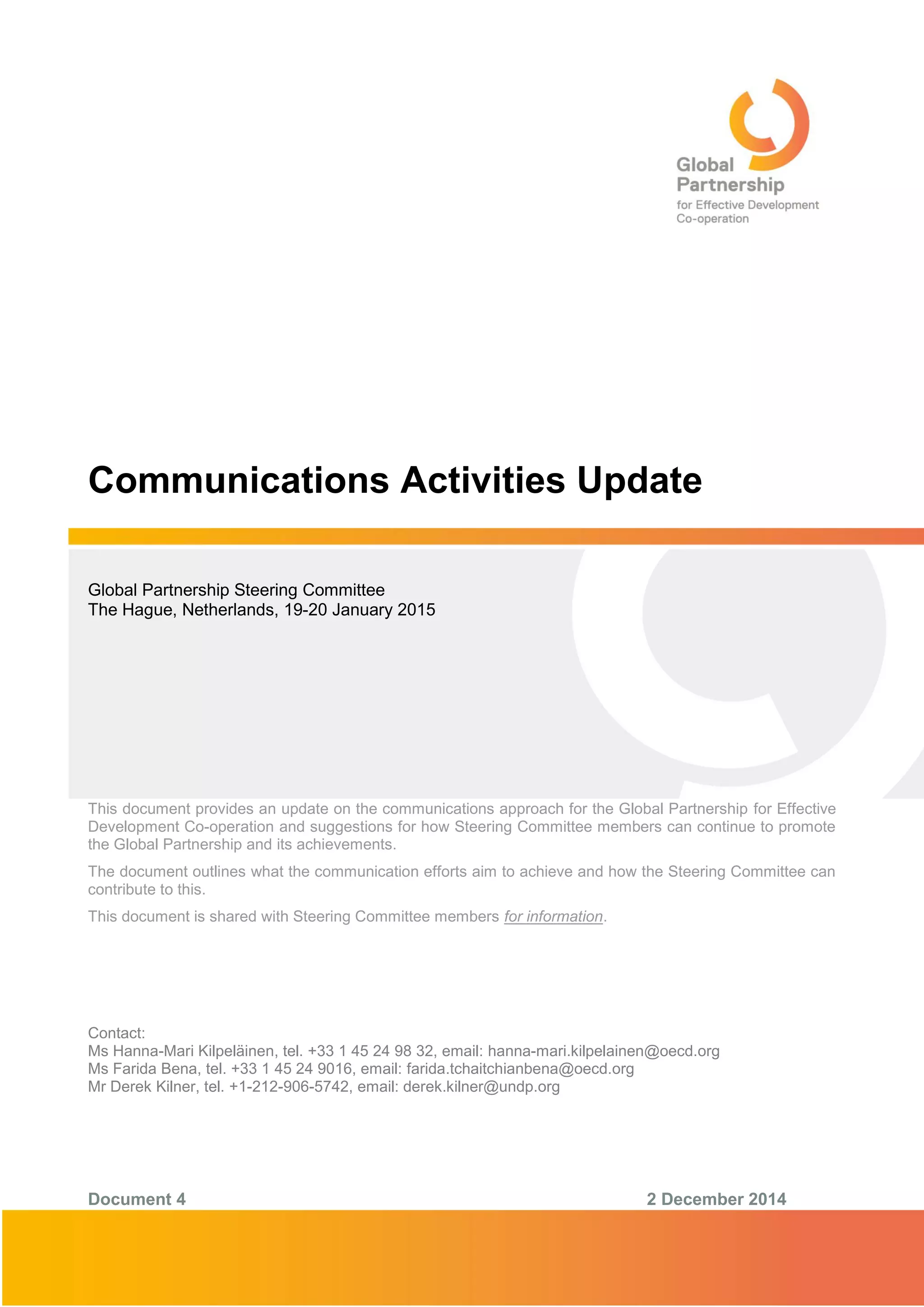 The document provides an update on communications activities for the Global Partnership for Effective Development Co-operation. It outlines efforts to promote the partnership's work and achievements through the website, social media, newsletter and other channels. It encourages Steering Committee members to share progress implementing development principles through these communications and support outreach initiatives with their own networks. The document also reviews tools like the online stakeholder platform for sharing information within the partnership.