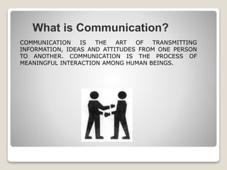 Effective communication involves properly encoding and transmitting a message through an appropriate channel so that the intended meaning is received. Common forms of communication include written word and email. To make emails effective, one should select the correct audience, use descriptive subjects, keep messages concise yet clear, and include a professional signature. Poor email habits to avoid are changing subjects without notification, including multiple subjects in one email, displaying all recipient addresses, and improperly replying or forwarding.