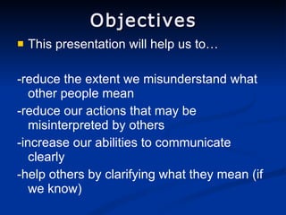 The presentation focuses on enhancing communication across different cultures by reducing misunderstandings and improving clarity. It highlights key aspects of communication, including verbal and non-verbal methods, and emphasizes the importance of understanding cultural differences in conversational styles, narrative forms, and social norms. The document advocates for proactive measures to adapt to multicultural environments, especially in diverse communities like Alberta.