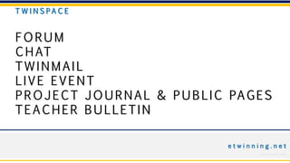The document provides information on various communication tools available in Twinspaces, which are online collaborative spaces for eTwinning projects. It summarizes the key features and functions of forums for asynchronous discussion, chat for live synchronous communication, Twinmail for messaging, live events for virtual meetings, project journals and public pages for sharing with external stakeholders, and teacher bulletins for private teacher discussions.