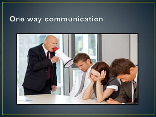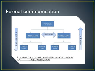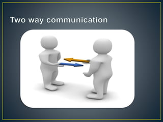 Communication is the process of exchanging ideas, feelings, and information between a sender and receiver using a channel. It involves transmitting a message from the sender, receiving feedback from the audience, and using different types of communication like verbal, nonverbal, and visual. Effective communication ensures the message is clear and any necessary supporting information is provided. Interpersonal relationships are strong associations between two or more people and involve different phases from initial interaction to termination. Problems can occur in interpersonal relationships, like loss of motivation, opposition, operational issues, task distortion, and authority problems, which reduce the effectiveness of groups.