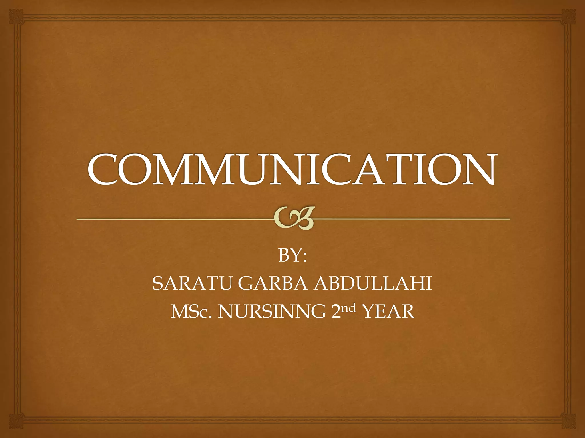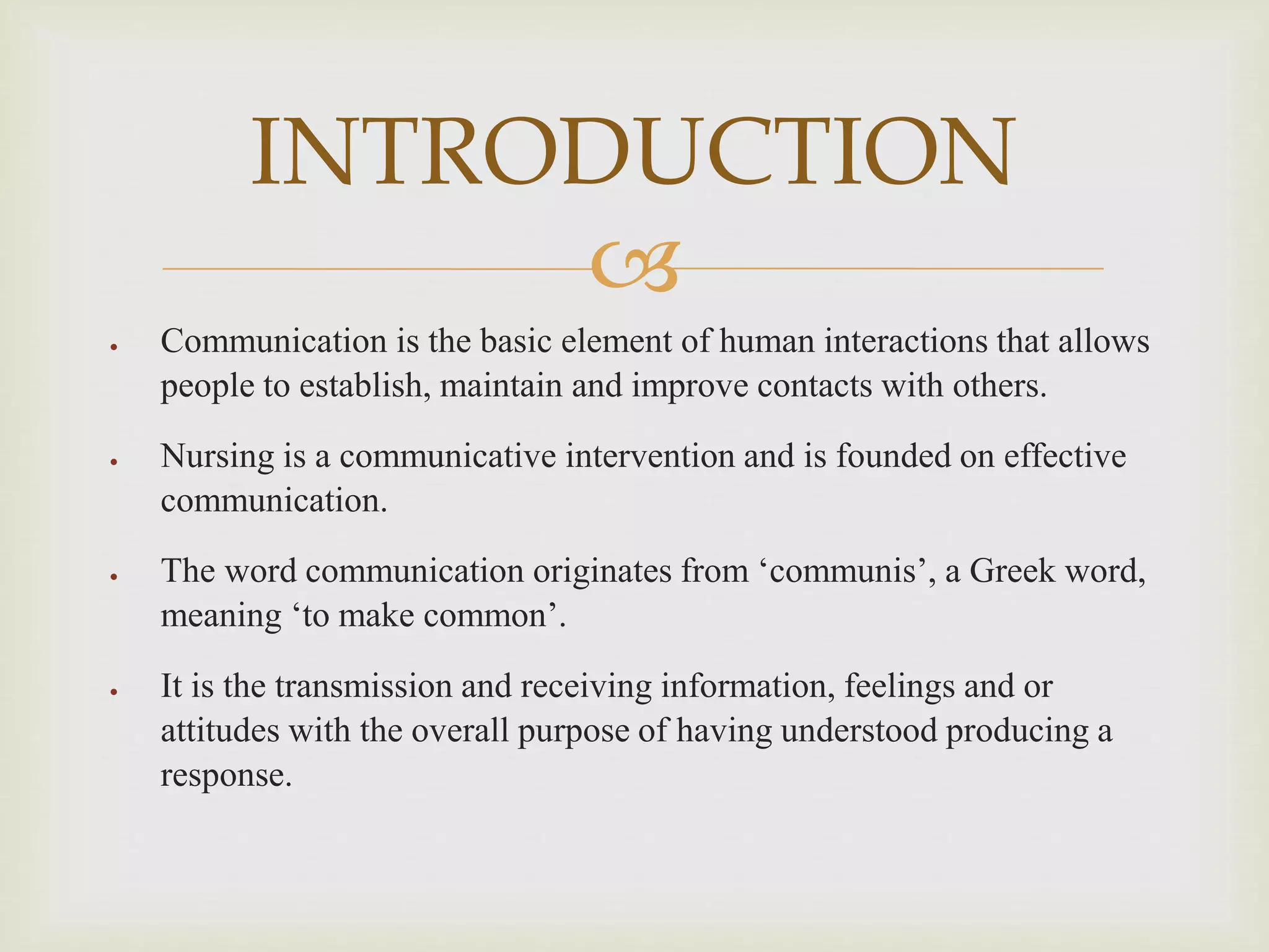 Communication is the transmission and receiving of information between two or more parties. It involves a sender, a message, a channel, a receiver, and feedback. Effective communication is fundamental to nursing practice. It generates trust between nurses and clients, provides professional satisfaction for nurses, and helps promote clients' well-being by enabling nurses to listen, speak, and act to negotiate changes. Developing strong communication skills is important for productive human interaction and relationships.