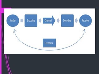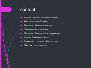 This document discusses communication and its processes. It defines communication and explains its role and elements, including verbal and non-verbal communication. The communication process and its elements such as the sender, message, encoding, channel, receiver, decoding, and feedback are described. Forms of communication like formal and informal communication are covered. Barriers to communication and techniques for effective communication are also summarized.