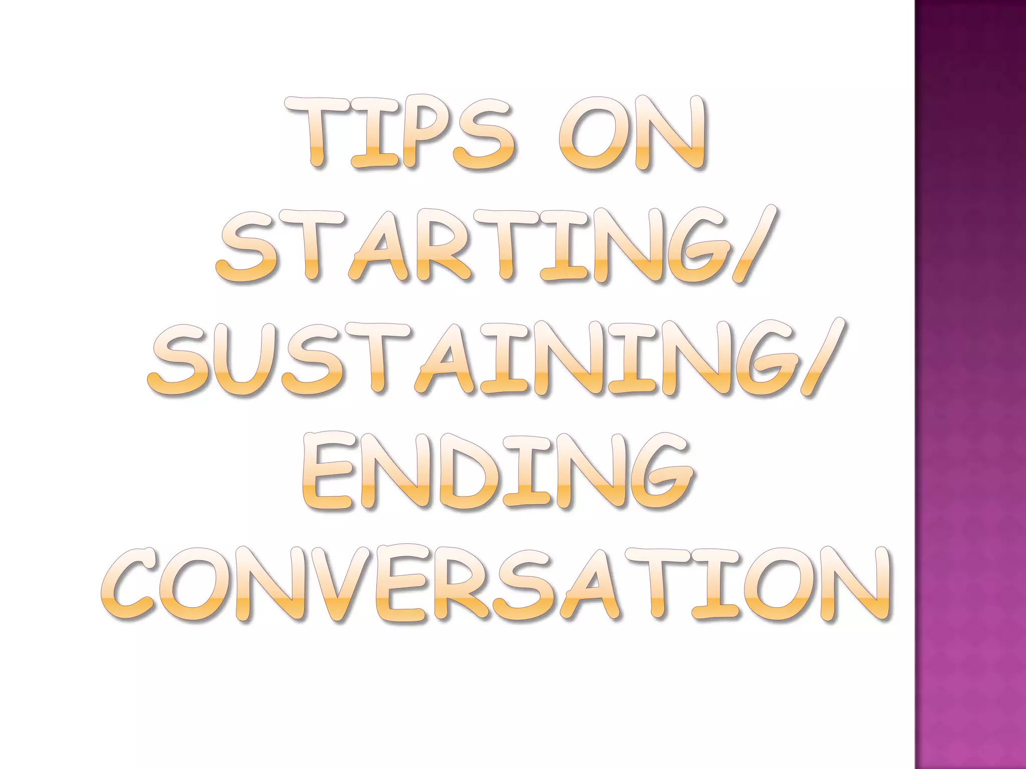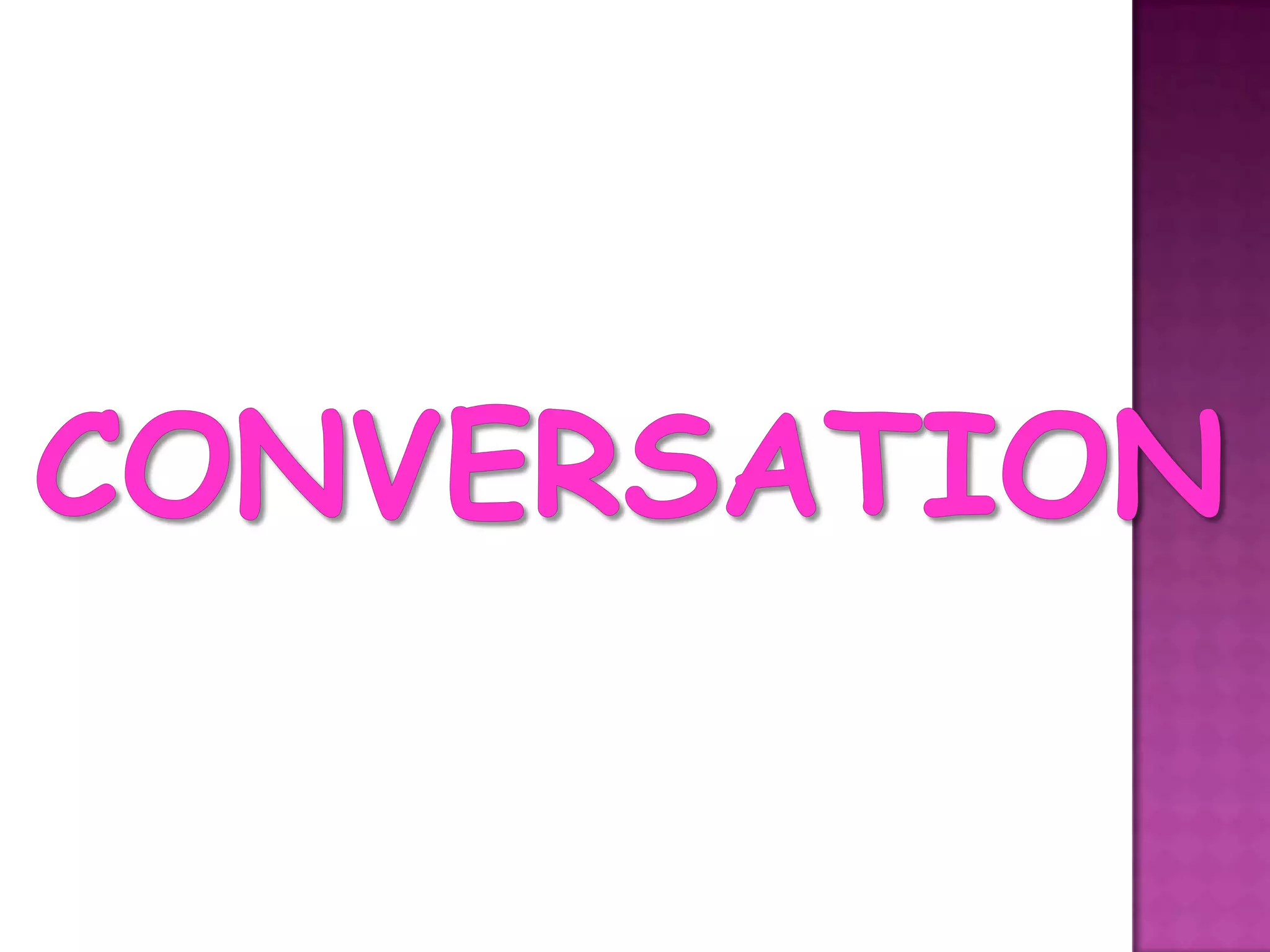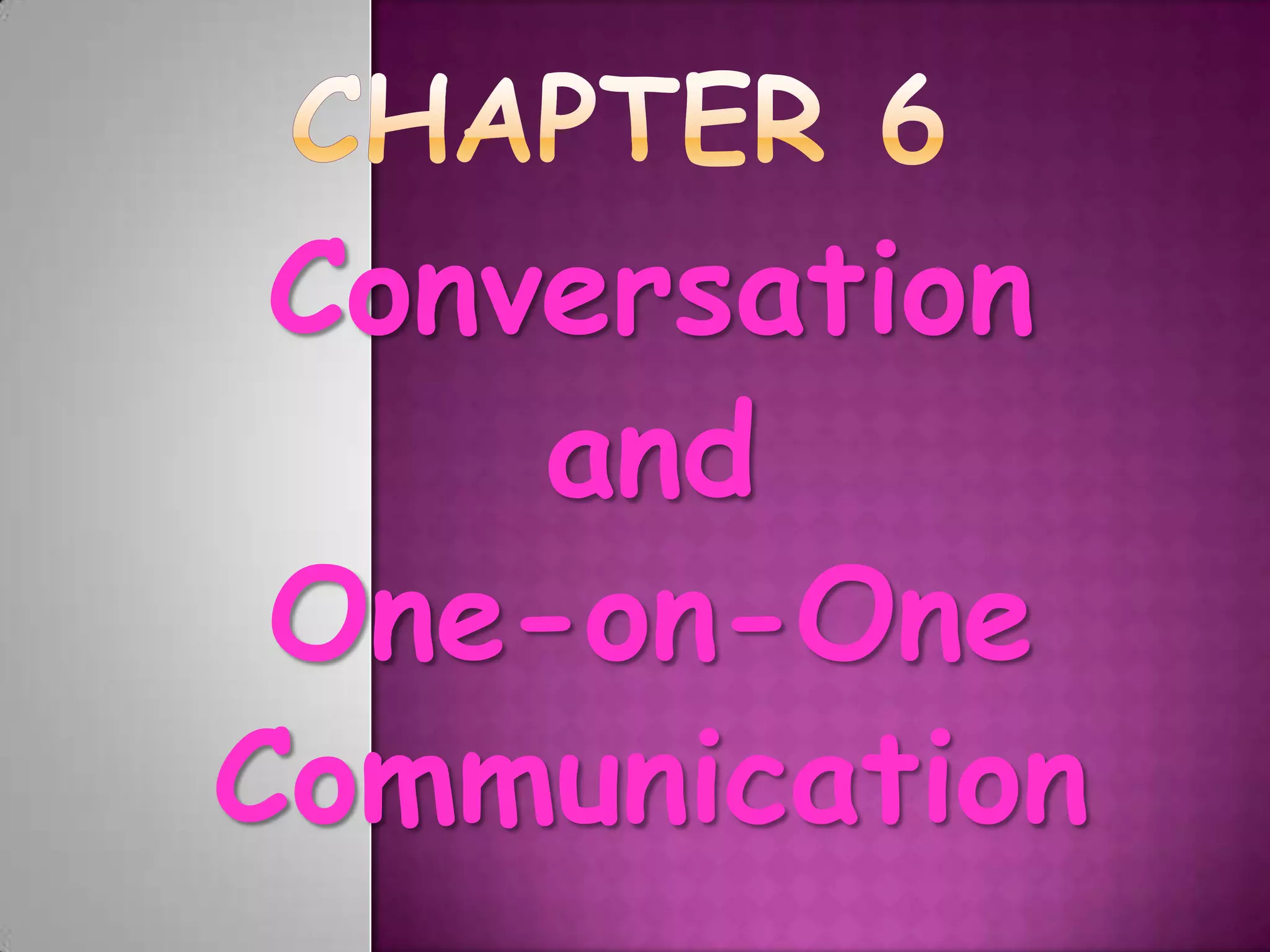 This document provides information about conversation and one-on-one communication. It discusses conversation as an art of free-wheeling discussion and the most common form of dyadic communication. It then provides tips for effective conversation including being yourself, being a good listener, waiting for your turn, and paying close attention. The document also outlines different types of communication acts such as making requests, offering assistance, and disagreeing. It concludes with guidelines for job interviews such as researching the company, preparing attire, bringing necessary documents, arriving early, anticipating questions, and providing concise answers.