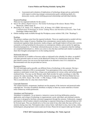 This document outlines the policies and schedule for Dr. Vinita Agarwal's Spring 2016 CMAT 465 Communication and Technology course. Key details include: