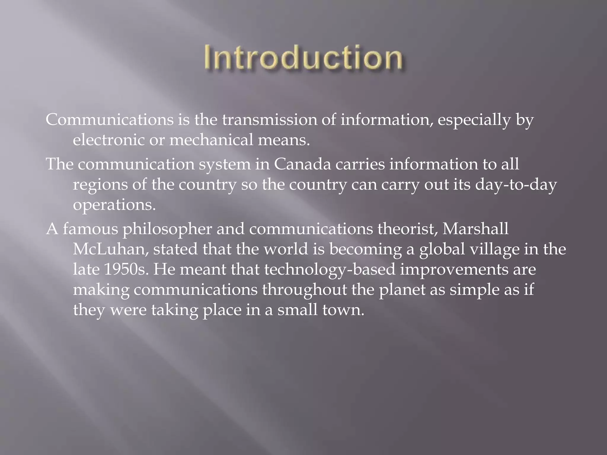 The document discusses Canada's communication system and how it has evolved over time. It notes that Canada has developed an extensive communication network to connect the vast geographic regions of the country. It traces the development of communication technologies from early writing and printing, to the telegraph, telephone, radio, television, internet and satellites. Most recently, it describes how communication technologies are converging, with different mediums like phones and internet merging together and blurring the lines between different communication systems. This convergence is transforming Canada's communication landscape.