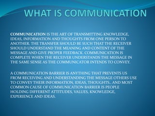 The document discusses various communication barriers that hinder effective information exchange, including physical, organizational, semantic, and personal barriers. It emphasizes that understanding the audience and simplifying messages are crucial for overcoming these barriers, as well as fostering an environment of trust and ethical communication. Strategies for improvement include observing the receiver, managing information overload, and using appropriate communication channels.