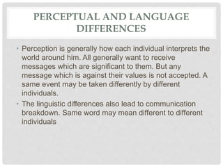 Communication breakdown can occur if there is wrong perception by the receiver. Perceptual and language differences, information overload, inattention, time pressures, distraction/noise, emotions, and poor retention can all lead to communication breakdown. Perception is interpreted differently by individuals and the same word can mean different things. Too much information, lack of focus, not allowing enough time, and distractions can cause the message to be misinterpreted, forgotten, or overlooked, reducing effective communication. Emotional state and inability to retain information can also influence how the message is received.
