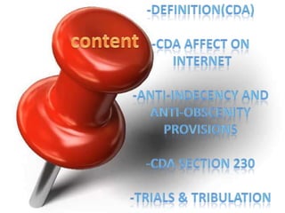 This document summarizes the 1997 Supreme Court case Reno v. ACLU, which ruled two provisions of the 1996 Communications Decency Act unconstitutional. The provisions criminalized sending or displaying indecent content online to those under 18. The Court found the provisions violated the First Amendment due to overbreadth, as they effectively banned access by adults to protected speech and the Internet cannot be restricted like broadcast media. While regulations may aim to create "adult zones," the CDA's restrictions went too far.