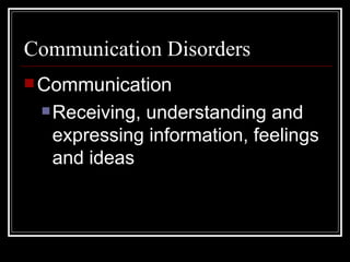 Communication disorders involve difficulties receiving, understanding, or expressing information through speech, language, or voice. There are several types of communication disorders including speech disorders like articulation disorders which involve difficulties producing sounds, and language disorders which involve difficulties with understanding or using language. Statistics show that around 18.8% of students receiving special education have speech or language services, and communication disorders are among the most common disabilities in the United States. Early identification and treatment of communication disorders can greatly improve a child's future success.