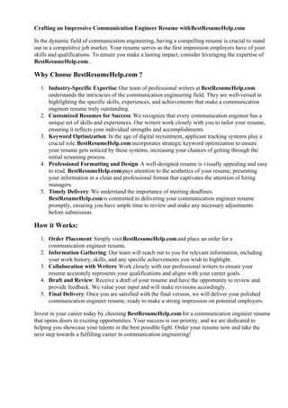 This document provides information on how to craft an impressive resume as a Communication Engineer. It discusses leveraging the expertise of BestResumeHelp.com to ensure your resume makes a lasting impact. BestResumeHelp.com offers industry-specific expertise, customized resumes, keyword optimization, professional formatting and timely delivery to help job seekers showcase their skills and qualifications.