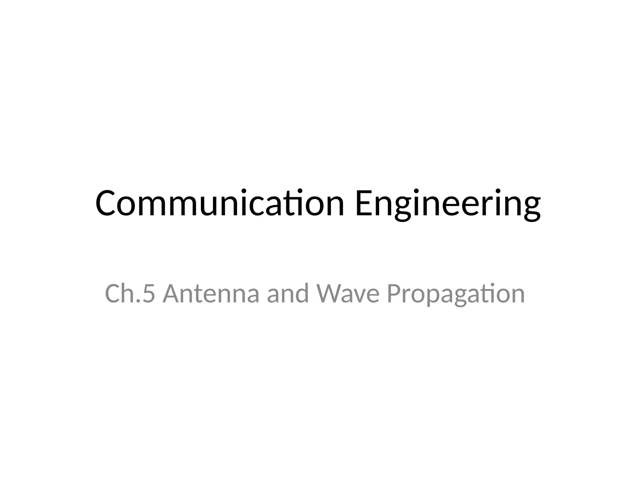 The document discusses various aspects of communication engineering, particularly focusing on antennas and wave propagation. It covers the applications of different parts of the electromagnetic spectrum, the fundamentals and types of antennas, including dipole and smart antennas, and various propagation mechanisms such as space wave, ground wave, and duct propagation. Additionally, it highlights key characteristics like antenna directivity, polarization, and performance metrics that are essential for effective wireless communication.
