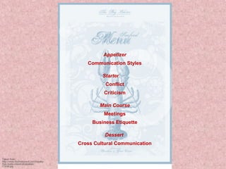 This document provides information on communication styles, conflict, criticism, meetings, and business etiquette across cultures. It discusses aggressive and passive communication styles and describes the assertive style as most effective. It defines conflict and its two types, lists potential causes, and outlines five strategies for managing conflict. The document explains the difference between constructive and destructive criticism and how to give constructive feedback. It also outlines best practices for planning and conducting effective meetings, including types of meetings, participant roles, and barriers to success. Finally, it discusses general business etiquette norms around greetings, attire, gift-giving, and dining as well as considerations for business etiquette specific to Indian culture.