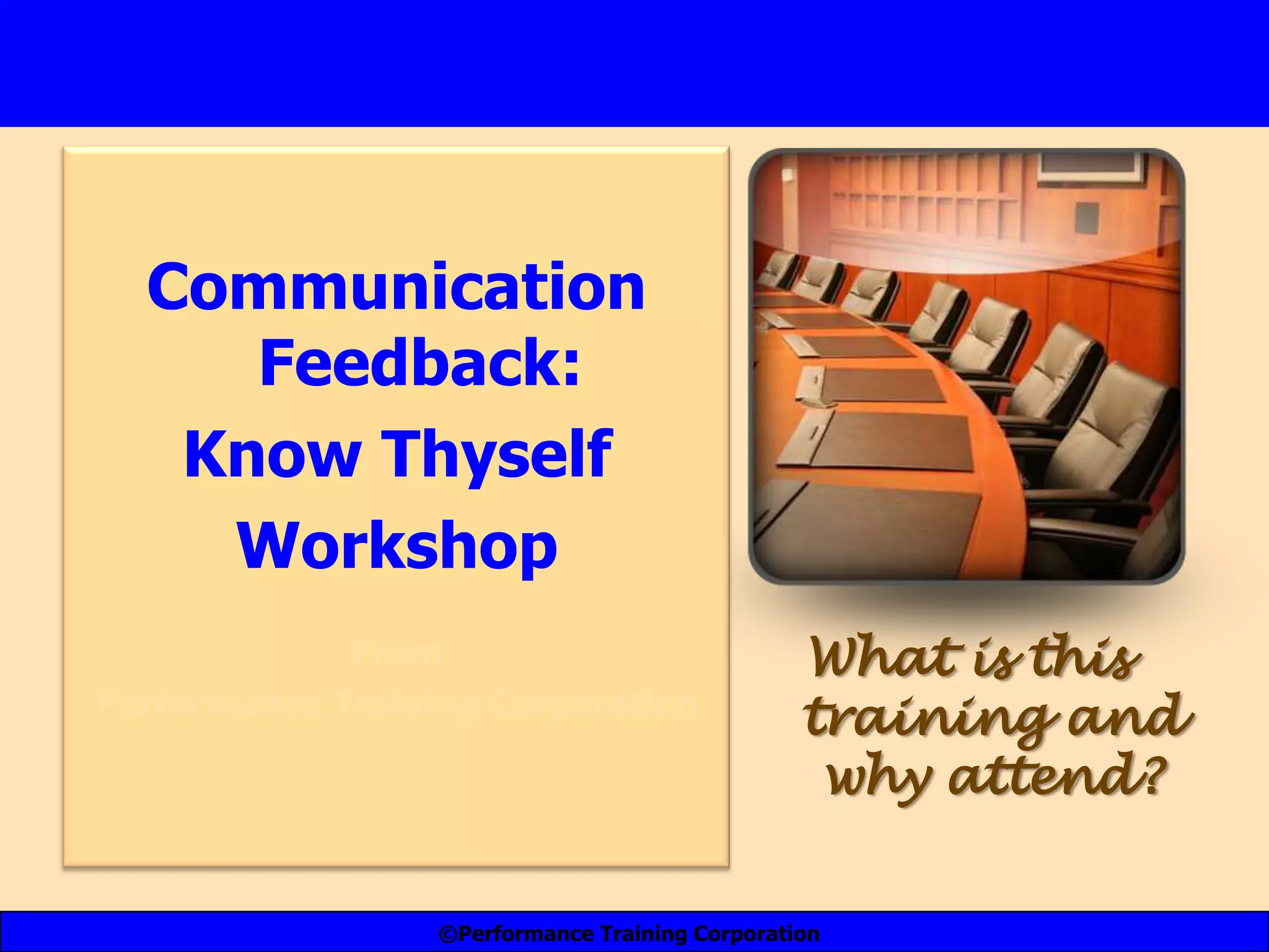 The document outlines a 'Know Thyself' workshop by Performance Training Corporation designed to enhance communication skills and self-awareness through feedback from various contacts. Participants will engage in a supportive learning environment with a diagnostic assessment and experienced instructor, fostering personal growth. The workshop aims to address individuals' blind spots and improve relationships without the pressure of performance reviews.