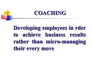This document discusses effective communication techniques for leadership. It emphasizes coaching employees to achieve business results rather than micromanaging. Leaders should build trust, listen, develop individual strengths, and endorse growth. Coaching involves stopping solutions and decisions, and creating an environment where people want to work. Asking open and probe questions seeks information and shows interest. Good listening involves concentrating, clarifying, and commenting without interrupting. Feedback should be specific, descriptive, and focus on behaviors. Counseling at work helps employees manage their own decision making. The counseling process includes understanding issues, empowering solutions, and providing resources. Effective counseling listens intelligently, avoids judgment, defines problems, changes perspectives, observes behavior, and concludes productively.