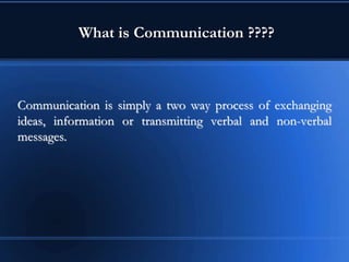 This document discusses communication skills and styles. It defines communication as a two-way process of exchanging information through verbal and non-verbal messages. Effective communication leads to productive relationships, while barriers like assumptions and poor listening skills can interfere. The document outlines the communication process and essential elements like eye contact and active listening. It also describes different communication styles and strategies for interacting with each style effectively.