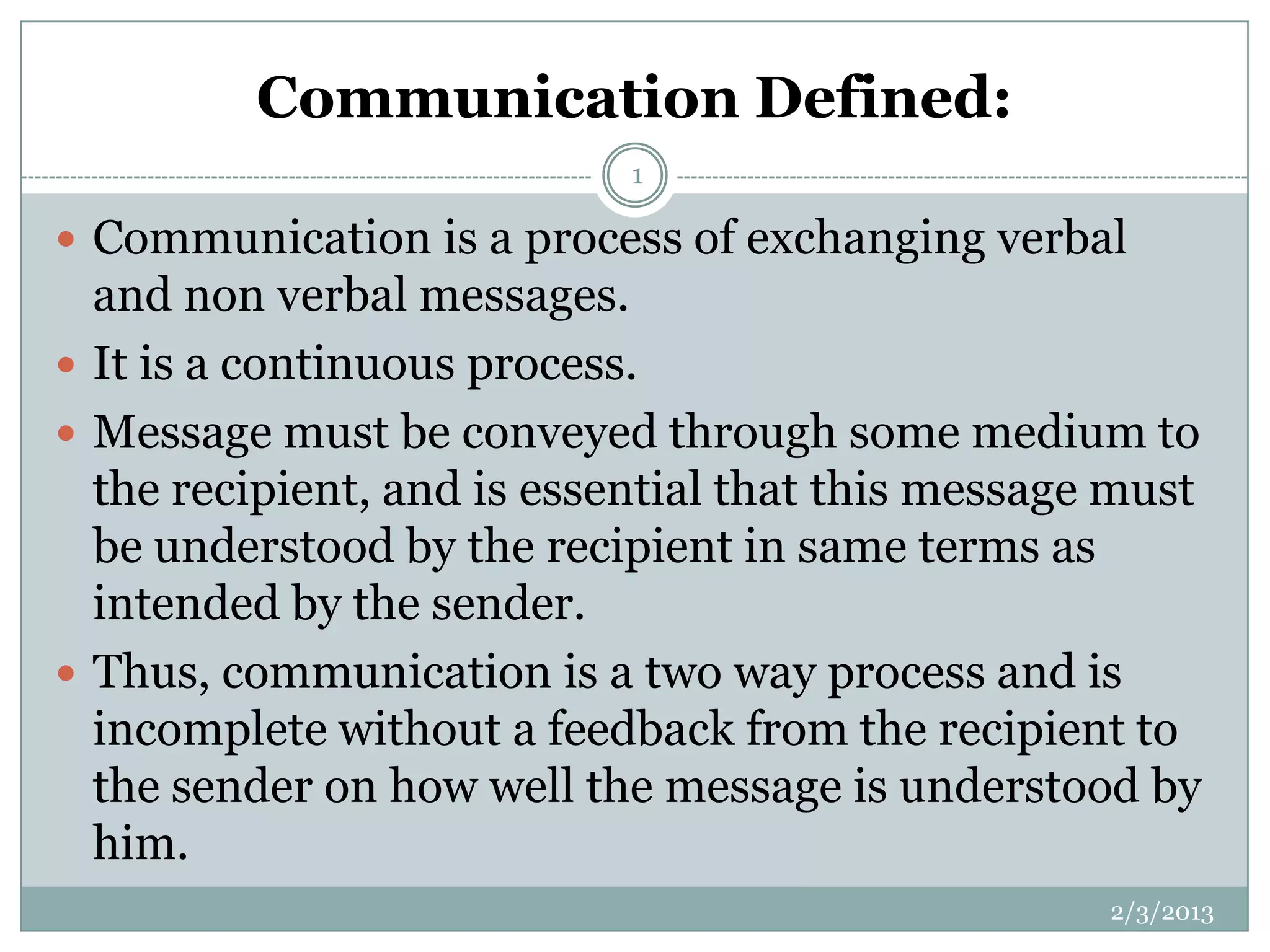 Communication is defined as the exchange of verbal and non-verbal messages through a medium between a sender and receiver. For communication to be effective, the message must be understood by the receiver in the same way intended by the sender. Communication flows in various directions within an organization, including downward from managers to subordinates, upward from subordinates to managers, and laterally between peers. Effective communication is important for management functions like planning, organizing, leading, and controlling, and promotes motivation, decision making, and socialization within an organization. Barriers to communication can occur from differences in perception, information overload, inattention, and other factors.