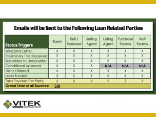 The document outlines the importance of clear communication in creating a successful buying experience for clients in real estate. It emphasizes proactive communication, real-time loan status updates, and ongoing improvement of the buyer experience. The presentation is intended for real estate professionals only, with a focus on maintaining transparency and support throughout the loan process.