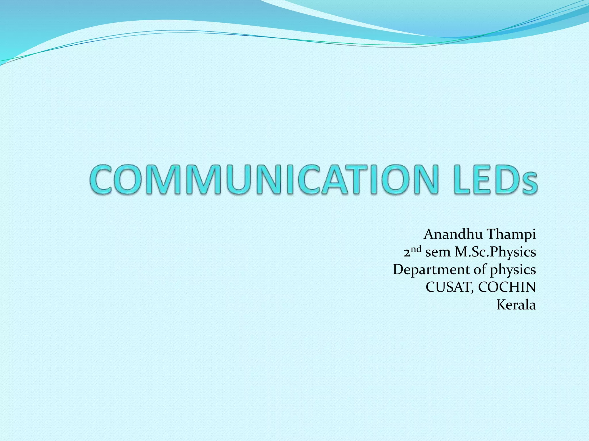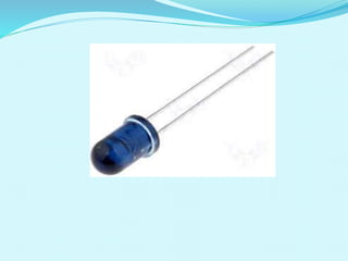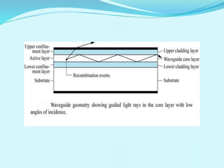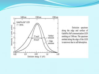 This document discusses double heterojunction LEDs and their use in optical fiber communication. It explains that a double heterojunction structure sandwiches a small bandgap semiconductor between two large bandgap semiconductors. This reduces light losses by emitting photons from the small bandgap region. Surface emitting LEDs and edge emitting LEDs are described as the main types used for fiber optic communication over short distances and low data rates. Common semiconductor materials and their emission wavelengths are also listed.