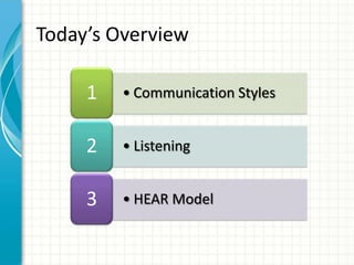 The document discusses the importance of communication and listening skills in the workplace, highlighting the H.E.A.R model (Hear, Empathize, Analyze, Respond) as a framework for effective listening. It emphasizes the need for active and empathetic listening to improve relationships and minimize mistakes. The document includes objectives aimed at enhancing listeners' abilities to communicate clearly and attentively.