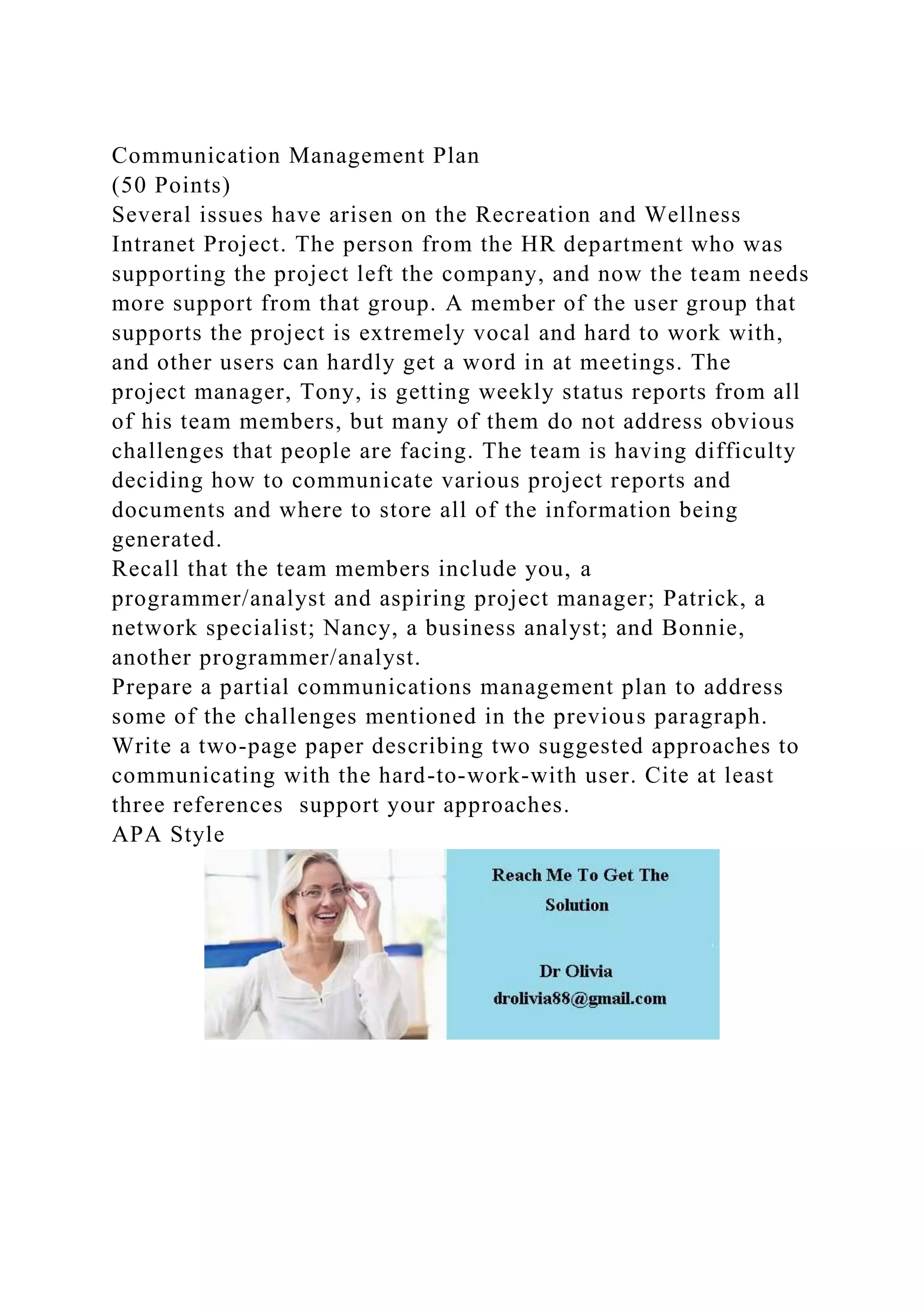 The document outlines challenges faced in a communication management plan for the recreation and wellness intranet project, particularly the departure of HR support and issues with a difficult user group member. The project manager is receiving incomplete status reports, and the team struggles with information storage and communication methods. It calls for a two-page paper proposing approaches to improve communication with the problematic user, supported by three citations in APA style.