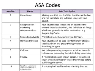The document discusses various Advertising Standards Authority (ASA) codes for advertising communications. It outlines 6 specific codes: 1) compliance, 2) recognition as marketing, 3) avoiding misleading claims, 4) preventing harm or offense, 5) suitability for children, and 6) privacy issues related to using people's images. It also mentions code 13 related to food, supplements and health claims. The mind maps and other documents discuss various creative methods - mind maps, mood boards, style sheets, layout plans, and brainstorming - used to develop an advertisement for Coca-Cola. Feedback on the strengths and weaknesses of each method is provided.