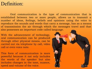 Oral communication involves the transmission of ideas, feelings, and opinions using voice and language, facilitated by technology such as phone and video calls. It has key characteristics including being dynamic, context-dependent, and requiring at least two participants, while potential defects may arise from poor vocabulary, nervousness, and incoherent expression. Various classification types exist for oral communication, and effective techniques such as diaphragmatic breathing and modulation can improve clarity and projection.