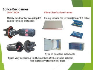 • Seals optical fibers: Joint boxes seal incoming cables to