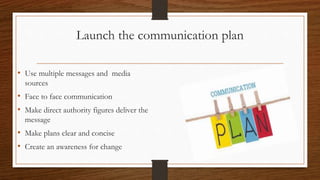 The communication plan outlines steps to launch, evaluate the effectiveness, generate feedback, and address negative responses to organizational changes. It recommends using multiple media sources and face-to-face communication delivered by authority figures to launch the plan. Effectiveness will be analyzed through financial results, customer equity, employee performance, and integration of changes. Surveys and continued awareness efforts will provide continuous feedback, while celebrating progress and addressing misconceptions. Negative responses will be handled through education, analysis, participation, and negotiation.