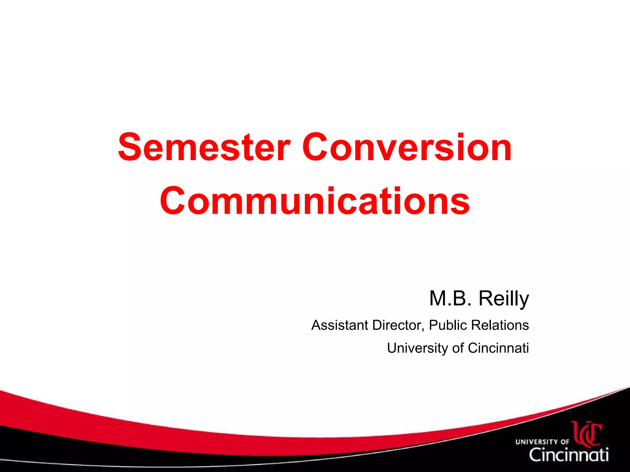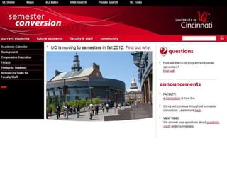The document outlines a communications strategy for a university's conversion from quarters to semesters. It identifies major and minor audiences that will need information at different phases of the conversion process. The strategy involves a central website and coordinated electronic, print, and in-person communications. The website at www.uc.edu/conversion will provide audience-specific information and resources to address concerns and needs throughout the conversion period.