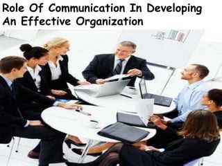 Effective communication is important for managers to plan, organize, lead and control organizations. Communication helps managers perform their jobs and communicate plans to implement them. It is also important for motivating employees, increasing productivity, and allowing employees to submit work reports and suggestions. There are several types of communication including intrapersonal (within oneself), interpersonal (between two people), intragroup (within a group), and intergroup (between groups). Each type plays an important role in developing effective organizations.