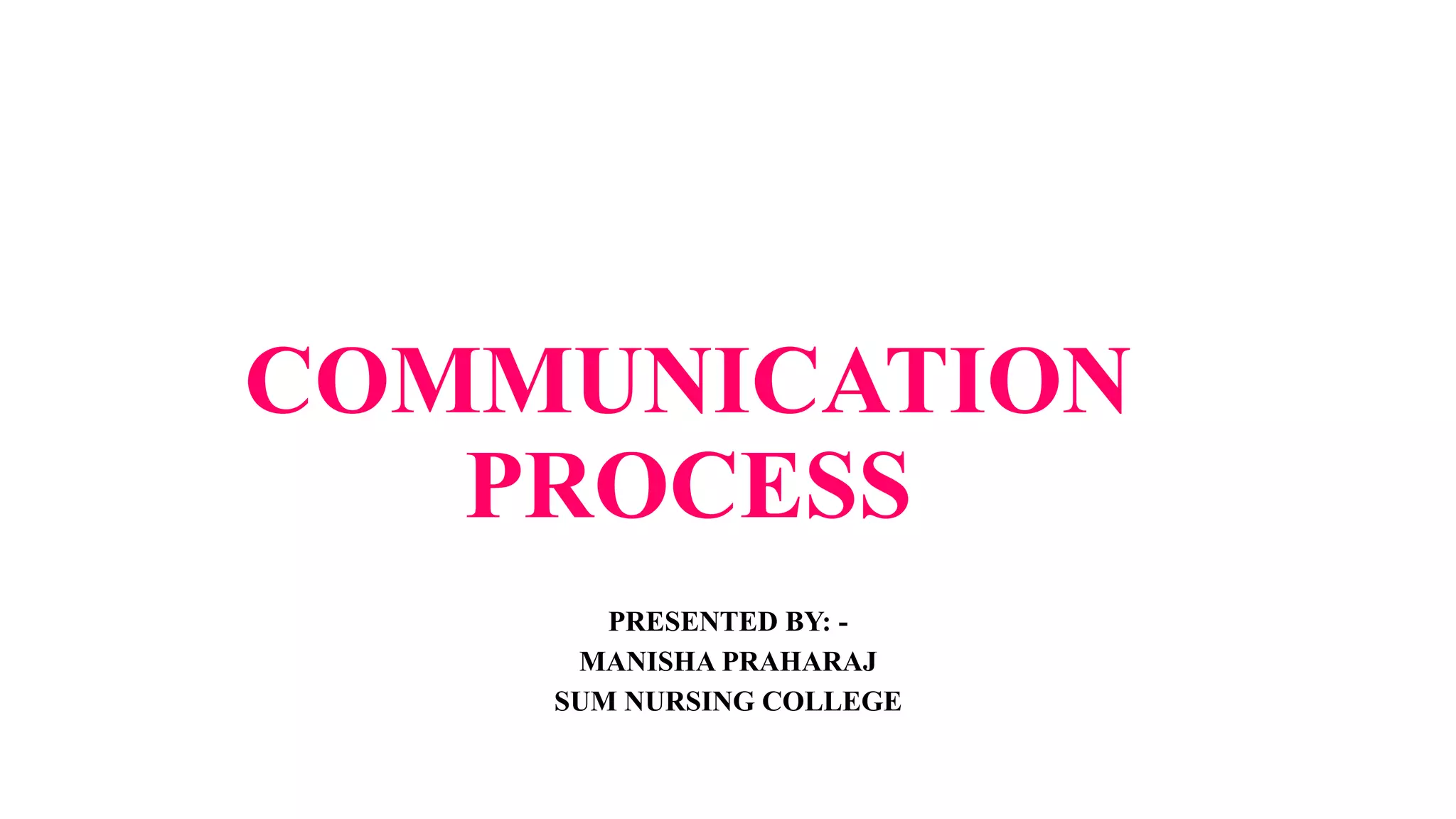 This document discusses the communication process. It defines communication as a two-way exchange of ideas, feelings, and information. The key aspects of the communication process are the sender, message, channel, receiver, and feedback. Communication can be verbal, including oral and written, or non-verbal using body language and other cues. Communication also varies based on its purpose (formal, informal, therapeutic), level (intrapersonal, interpersonal, group, mass), and pattern (one-way, two-way, one-to-one, one-to-many, many-to-one). Barriers to communication include physical, perceptual, interpersonal, emotional, cultural, language, and gender factors. Overcoming