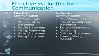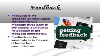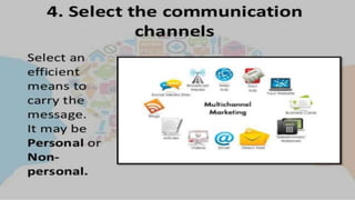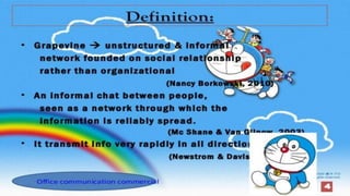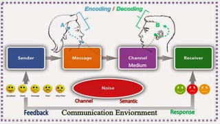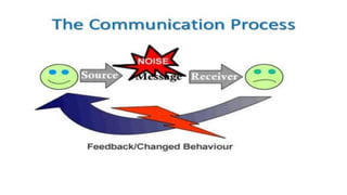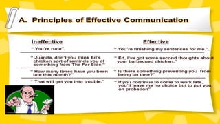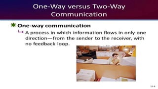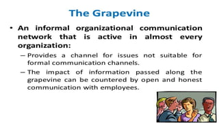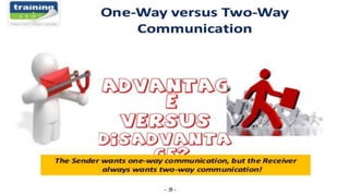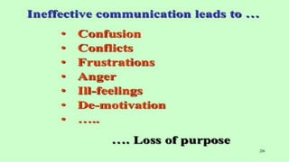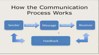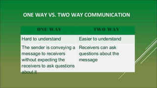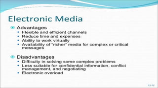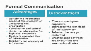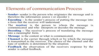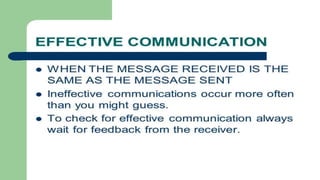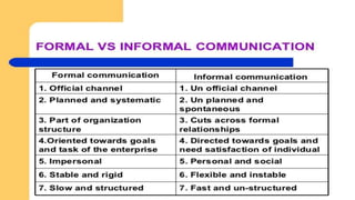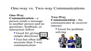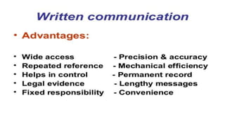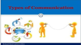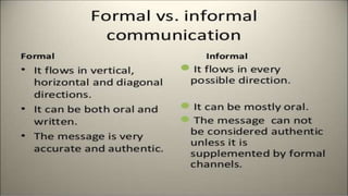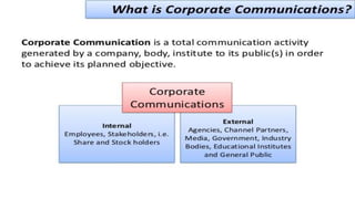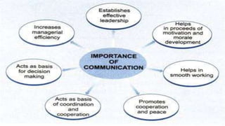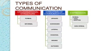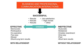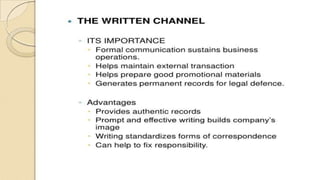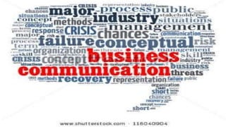 The document discusses communication in business and its objectives. Business communication aims to ensure the efficient and effective operation of a business. It explores the different channels of communication that can be used in business, such as oral, written, electronic, and directional communication both formally and informally.
