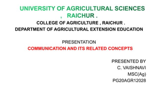 The document discusses the concept of communication within agricultural extension education, emphasizing its importance in sharing information effectively. It outlines the roles of communicators, messages, channels, and audience feedback, as well as different methods and models of communication. Additionally, it identifies barriers to effective communication and suggests strategies for overcoming these barriers to enhance understanding and engagement.