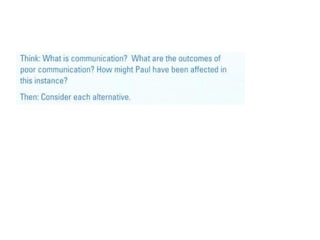 The document discusses communication in the workplace. It defines communication as the process of sending and receiving information. Good communication is important for businesses as it provides information, instructions, allows for coordination, and clarifies issues, which can improve customer service and business performance. The document outlines different types of communication including internal and external, formal and informal, upward, downward, and horizontal. It also discusses various communication methods, channels, barriers to effective communication, and how technology has impacted workplace communication.