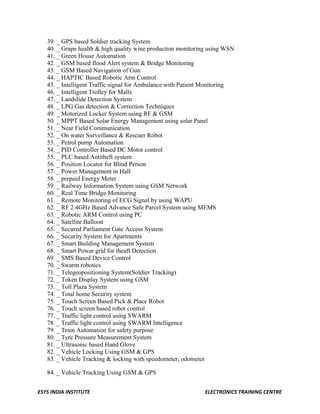 The document lists 95 potential projects based on communication technologies. The projects cover a wide range of applications including security systems, robotics, transportation, medical monitoring, agriculture, and more. Many of the projects involve integrating communication protocols like Bluetooth, Zigbee, GSM, and WiFi with sensors, microcontrollers and other devices to enable remote monitoring and control of systems.