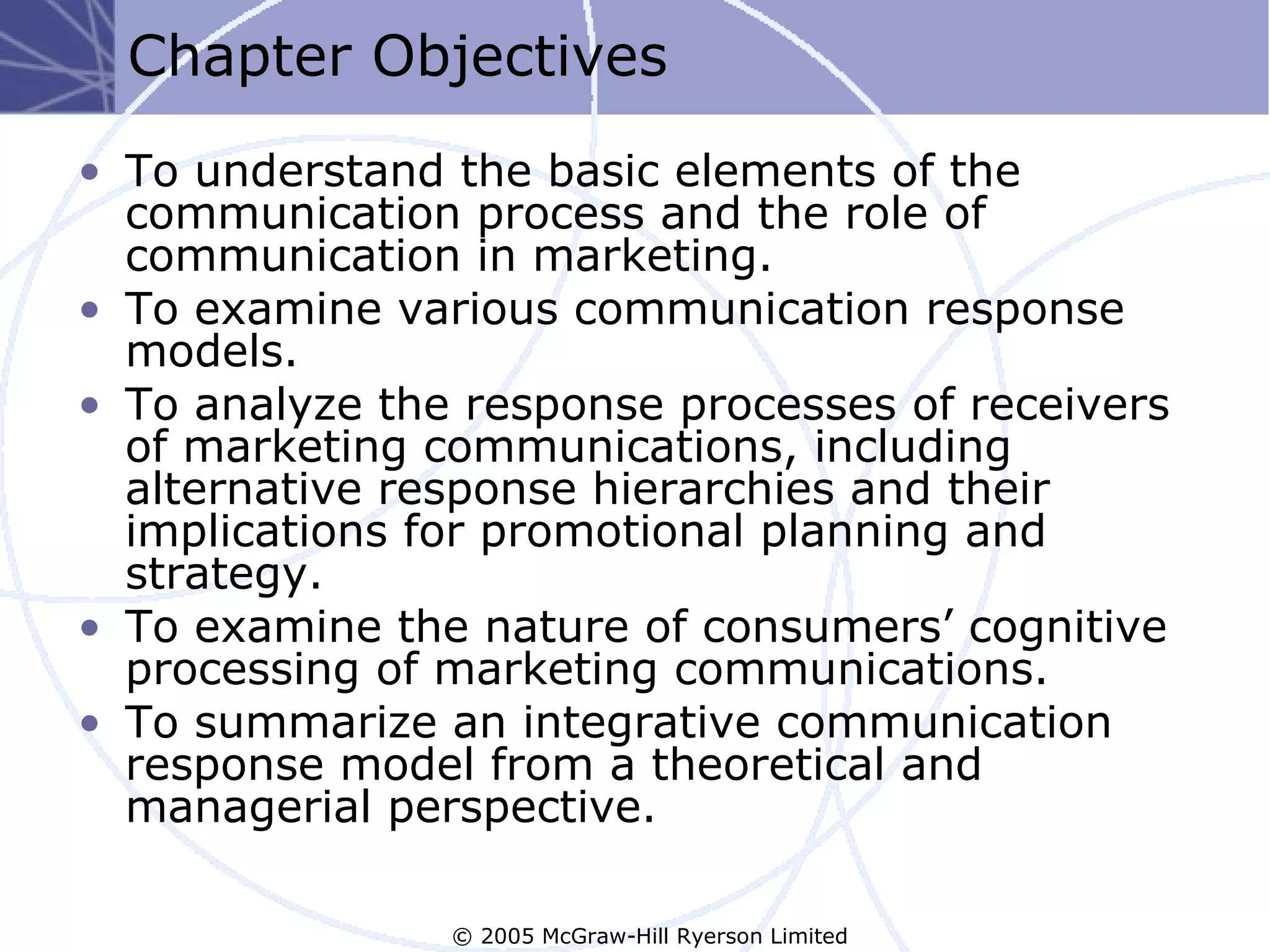 This document discusses communication response models and the cognitive processing of marketing communications. It provides an overview of the basic elements of the communication process, including the source, message, channel, receiver, decoding, noise, and response. Several traditional response hierarchy models are examined, including AIDA, the hierarchy of effects model, and the information processing model. The document also discusses alternative response hierarchies and the implications of different models. Finally, it introduces the cognitive response approach for analyzing the thoughts consumers have in response to marketing messages.