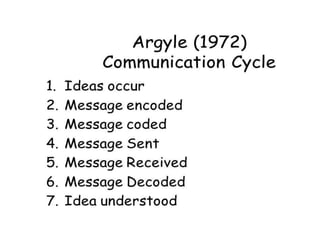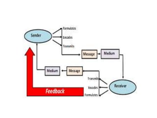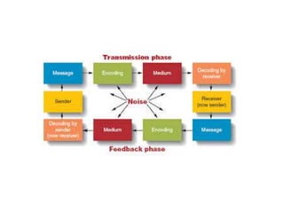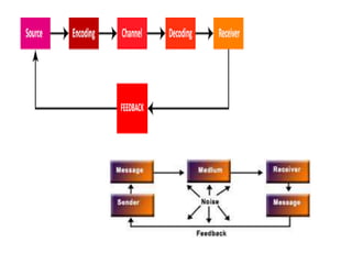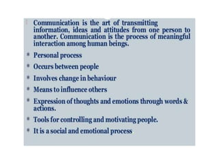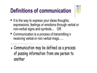 The document discusses principles of communication including definitions, concepts, theories, and elements. It defines communication as the sharing of ideas and feelings between two or more people through various channels and symbols. Two key theories of communication mentioned are cognitive dissonance theory, which discusses how people seek to avoid conflicting beliefs, and communication accommodation theory, which examines how people adjust their communication styles when interacting with others. The document also outlines the basic components and cycle of the communication process, including the sender, message, medium, receiver, and potential issues that can occur at each stage.