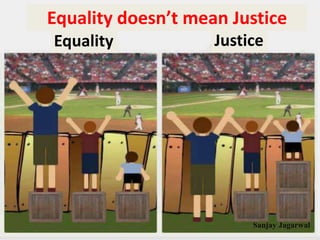 Equality and justice are related but distinct concepts. Equality refers to treating all people the same, while justice considers fairness and individual circumstances and outcomes. True justice cannot be achieved through equality alone. Different cultures understand justice in varying ways based on their shared history and beliefs. Key debates around justice include whether it stems from divine commands, natural law, human design, or a balance of consequences. Theories of justice also consider how to distribute goods fairly in a society.