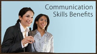 The document discusses communication, including its basics, types, levels, and benefits. It defines communication as the process of passing information from one person to another. The basics of communication are described as reading, writing, listening, and speaking. Types include verbal-written, non-verbal, formal, visual, and informal. Benefits include building trust, preventing problems, providing clarity, creating better relationships, and improving productivity.