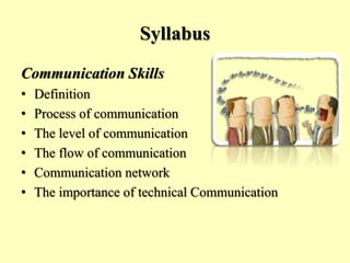 Communication is the exchange of information between individuals through a common system of symbols, signs or behavior. It involves five main steps - ideation, encoding, transmission, decoding and response. Communication can occur through different levels like interpersonal, group, organizational and mass communication. Effective communication requires good command over language and follows certain characteristics. Technical communication is more formal in style and involves technical vocabulary or graphics. It plays a pivotal role in organizations and their success depends on quality information flow. Some important books and Ted talks on developing strong communication skills are also mentioned.