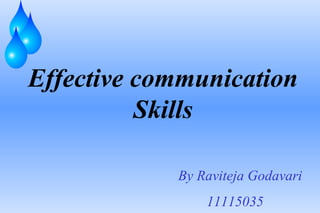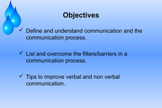 This document defines communication and discusses effective communication skills. It outlines the communication process, including encoding and decoding messages, as well as barriers like noise, assumptions, and distractions. Both verbal and nonverbal communication are covered. Verbal communication includes oral and written, while nonverbal looks at appearance, body language, and sounds. Tips are provided for improving communication skills, such as speaking clearly, actively listening, improving language skills, and using positive body language like maintaining eye contact and smiling. The key message is that communication is an important skill for success in today's diverse workplaces.