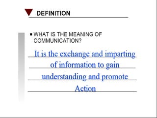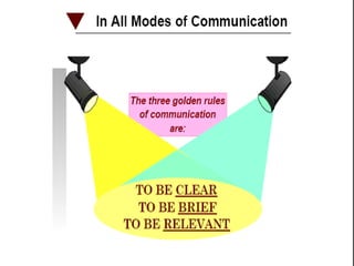 The document discusses various aspects of effective communication. It begins by describing three managers with different communication outcomes. Effective communication leads to interpersonal satisfaction, work motivation, getting responses wanted, and cooperation. The communication process involves listening, which requires active participation. Barriers to communication can occur at the individual, organizational, or message level. Different forms of communication are discussed, including verbal, non-verbal, oral, written, electronic, and meetings. Tips are provided for improving communication skills like listening, asking questions, and making a good first impression.