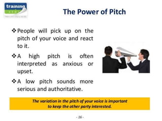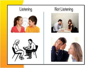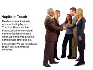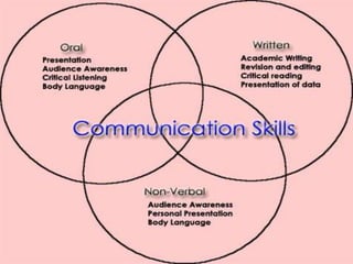 This document discusses the importance of effective communication skills, emphasizing the significant role of listening, body language, and non-verbal cues. It outlines various techniques to improve communication, including active listening, maintaining appropriate eye contact, and understanding different handshakes. Additionally, it highlights how posture, gestures, and proximity affect the perception and outcomes of interactions.
