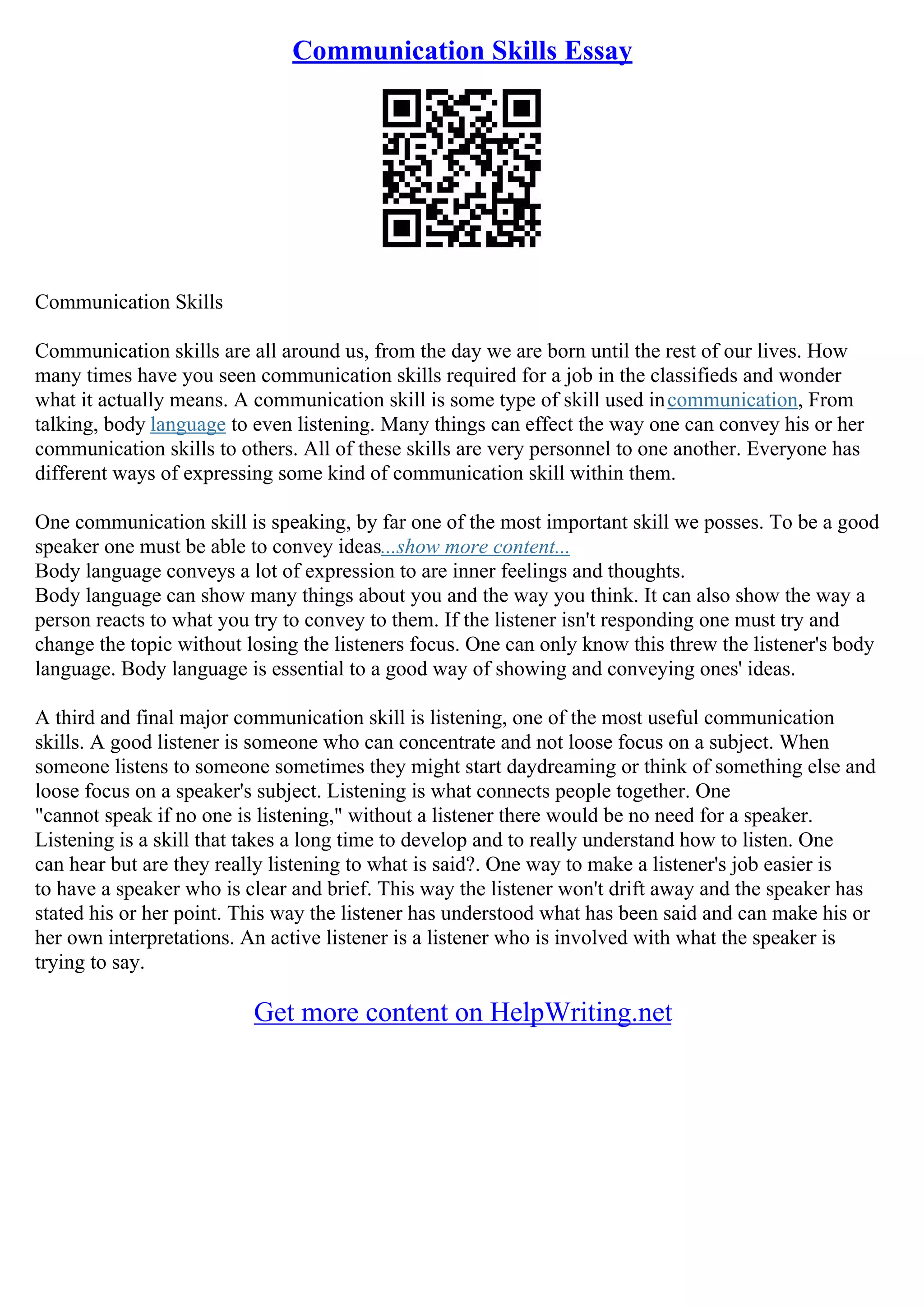 The document discusses the importance of communication skills, which encompass speaking, body language, and listening. It highlights how these skills impact interpersonal communication and the barriers that can hinder effective communication, such as distractions and cultural differences. The essay reflects on personal experiences related to improving communication skills and the development of self-image and perception over time.