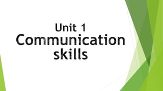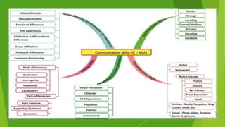 This document discusses communication skills and barriers to effective communication. It defines communication and its key elements, including the sender, message, encoding, channels, receiver, feedback. It also describes the 7Cs of effective communication: clear, concise, concrete, correct, coherent, complete and courteous. Various barriers to communication are outlined such as physical, language, gender, attitudinal, perceptual and emotional barriers. The document concludes with an activity to practice communication skills through a blindfold game to build trust, listening and instructional abilities.