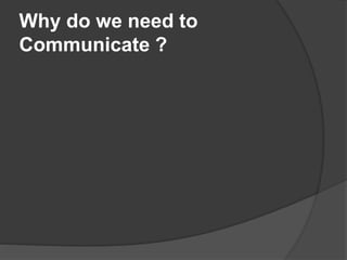 The document discusses the importance of communication and communication skills. It defines communication skills as the abilities used to give and receive information effectively. There are two main types of communication: verbal communication involving language, and non-verbal communication involving body language. Effective communication skills include active listening, understanding body language and communication styles, encouraging conversation, maintaining a positive attitude, and showing empathy and respect.