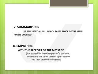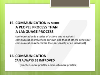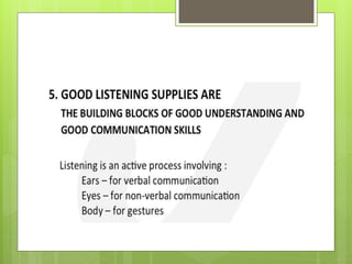 This document discusses communication skills and effective communication. It defines communication as a process of sending and receiving information among people using various channels. Effective communication skills are critical for careers and personal lives and involve verbal, nonverbal, and paraverbal messages. Barriers to communication include semantic, emotional, organizational, and personal factors. The document provides tips for developing communication skills such as active listening, overcoming barriers, and ensuring messages are clear, concise, and incorporate feedback.