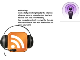 The document discusses several communication technologies including email, podcasting, instant messaging, discussion boards, SMS text messaging, blogs, the iPhone, the Palm Pre smartphone, and BlackBerry. It provides descriptions of the basic functions and features of each technology such as allowing users to subscribe to feeds, communicate in real time, post and view information, send short messages from mobile devices, maintain online diaries, and access the internet, email, apps and media from mobile touchscreen devices.