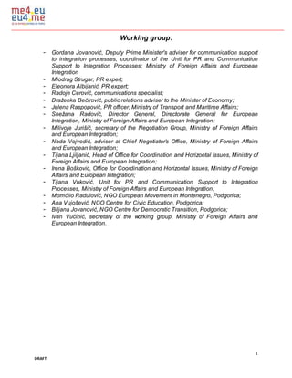This document outlines a strategy for informing Montenegrin citizens about the European Union and Montenegro's EU accession process from 2014-2018. The strategy aims to improve citizens' understanding of the commitments, responsibilities, and benefits of EU membership. It also seeks to address a lack of interest and knowledge among citizens regarding the accession process. The strategy was developed by the Montenegrin government in consultation with communications experts, NGOs, and international partners. It analyzes strengths, weaknesses and lessons learned from past communication efforts. The strategy defines communication objectives, target audiences, messaging, channels, implementation structures and a monitoring/evaluation plan to achieve greater citizen support and engagement regarding Montenegro's EU integration path.